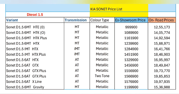 Kia SONET all Variants Latest On Road Prices